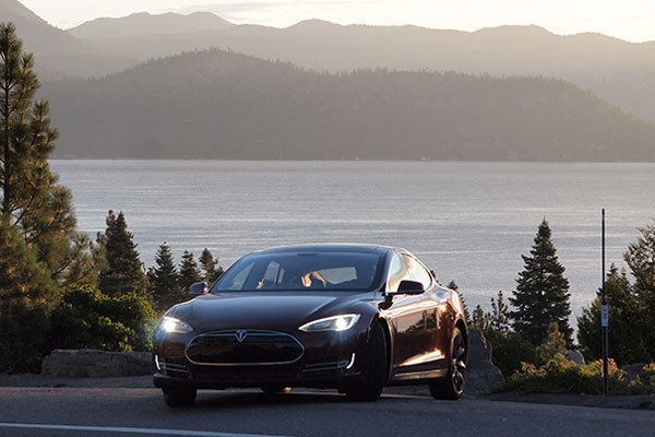 7.剛剛在特斯拉充電樁完成充電的汽車在加州附近的太浩湖即將開(kāi)始530英里的旅程。