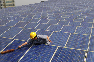 一名工人正在清潔房頂上的太陽能板。天臺太陽能板的鋪設增加了消防救援的難度。(路透社)