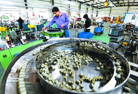 8月2日,淮濱縣鑫展電子有限公司員工正在生產(chǎn)鋁電解電容器。該企業(yè)從深圳轉(zhuǎn)移到該縣產(chǎn)業(yè)集聚區(qū),已形成了年產(chǎn)7億只鋁電解電容器的生產(chǎn)規(guī)模。記者 王天定 攝