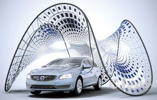 這個太陽能電池板采用了可折疊設計。當你把車停下來時,這個太陽能電池板就可以打開,通過太陽能為汽車的電源充電。只是打開之后你可能嚇一跳,因為這看起來就像一個巨大的花朵。而且是比汽車還巨大。難道說這種設計,可以馬上把汽車的電充滿?因為畢竟如此的設計,必須有足夠大的停車場才行。不過似乎并不是。據了解,這個解決方案被稱作“Pure Tension”(純張力),它是一款便攜式的大帳篷,展開后就是拋物線的形狀,上面嵌入了一系列的太陽能光伏面板。不過給電池充滿電需要一整天的時間。據稱,目前這套太陽能充電系統已經能在沃爾沃V60混合動力版上良好運行。