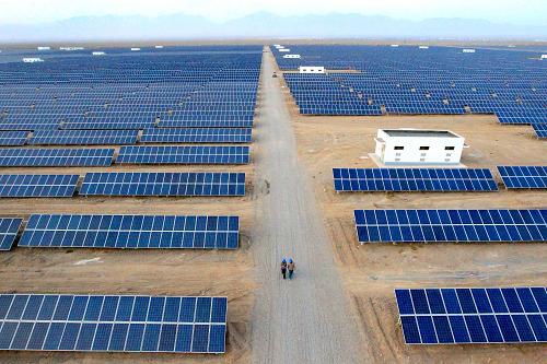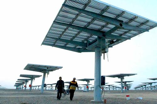 2013年10月24日,技術人員從新疆哈密石成子光伏園區的太陽能電池板旁走過。新疆哈密風電、光電資源豐富,截至目前,新疆哈密獲得核準風電項目55個,總規模426.9萬千瓦,現已有22個風電項目并網發電,容量達126.9萬千瓦;獲得核準光伏項目31個,總規模66萬千瓦,現已有11個光伏發電站并網發電,容量達21.5萬千瓦。