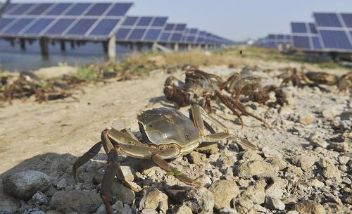2013年10月24日,螃蟹在江蘇鹽城市建湖縣境內的“漁光互補”光伏發電站內爬行。建湖縣從2011年開始分期建設“漁光互補”光伏發電站,在水面上方架設光伏組件發電,利用水體進行水產養殖,提高了水面資源利用效率。新華社發(濮良平 攝)