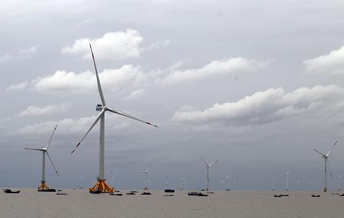 這是2013年10月18日拍攝的國電龍源江蘇省如東縣海上風電場一角。該風電場是國內首個海上風電場示范項目,目前總裝機容量達232兆瓦,被《亞洲電力》授予“2013年亞洲電力獎年度最佳風電項目獎”。新華社發(許叢軍 攝)