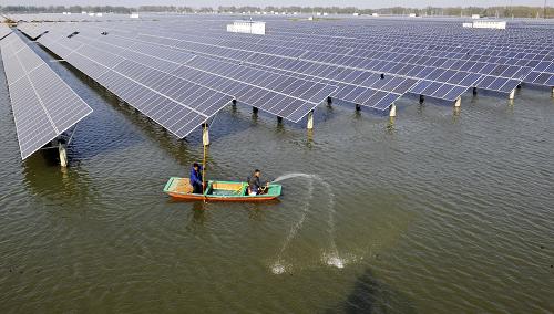 10月24日,工作人員在江蘇鹽城市建湖縣境內的“漁光互補”光伏發電站清潔水體。建湖縣從2011年開始分期建設“漁光互補”光伏發電站,在水面上方架設光伏組件發電,利用水體進行水產養殖,提高了水面資源利用效率。新華社發(濮良平 攝)