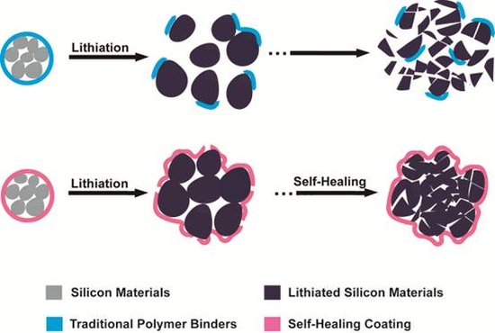 這種自愈化合物是由來自斯坦福的王超(音譯)和北京清華大學的吳輝(音譯)共同開發(fā)的,它可以在瞬間修復自己。“我們發(fā)現(xiàn)在硅電極上添加自愈性化合物可以延長其10倍的壽命,在幾個小時內(nèi)就修復了之前的分裂,”斯坦福的鮑鎮(zhèn)安(音譯)教授表示,鮑鎮(zhèn)安教授的團隊曾幫助開發(fā)具有彈性的電子機器人外殼。