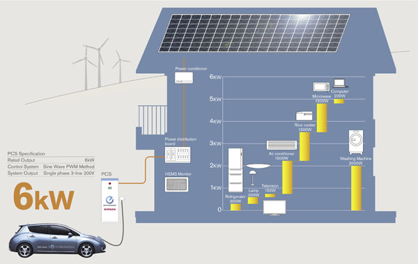 其基本原理是,通過PCS(Power Control System)將Leaf電動車與家用供電網絡對接。Leaf的電池會提供最大功率為6kW的電力輸出,這樣就能保證最耗電的家用電器(如微波爐、空調等)也能同時間正常運作,而不至于發生跳閘現象。這樣一套系統對于打造智能、低碳居所具有十分重要的意義,因為它把汽車這樣一個硬件也當做“家用電器”涵蓋了進來。據悉,Leaf-To-Home系統的安裝價格是33萬日元(約合1.95萬人民幣),聽起來也并不便宜。