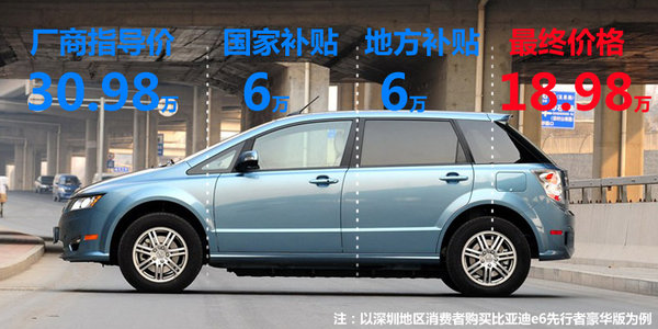 根據(jù)國(guó)家及地方的補(bǔ)貼政策我們可以算一筆賬,以深圳地區(qū)的消費(fèi)者購(gòu)買比亞迪e6 (詳情 圖片 報(bào)價(jià))為例,比亞迪e6先行者豪華版廠商指導(dǎo)價(jià)為30.98萬(wàn)元人民幣,深圳地區(qū)的消費(fèi)者最終將其購(gòu)買下來(lái)的最終價(jià)格僅為18.98萬(wàn),這在廠商指導(dǎo)價(jià)上足足優(yōu)惠了12萬(wàn)元,這將是一個(gè)不小的數(shù)目.