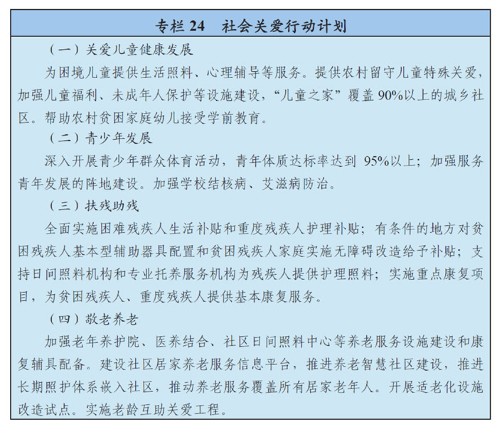 健全以扶老、助殘、愛幼、濟(jì)困為重點(diǎn)的社會(huì)福利制度。建立家庭養(yǎng)老支持政策,提增家庭養(yǎng)老扶幼功能。做好困境兒童福利保障工作。完善兒童收養(yǎng)制度。加強(qiáng)優(yōu)撫安置工作。發(fā)展公益性基本殯葬服務(wù),支持公共殯儀館、公益性骨灰安放(葬)設(shè)施和墓地建設(shè)。加快公辦福利機(jī)構(gòu)改革,加強(qiáng)福利設(shè)施建設(shè),優(yōu)化布局和資源共享。大力支持專業(yè)社會(huì)工作和慈善事業(yè)發(fā)展,健全經(jīng)常性社會(huì)捐助機(jī)制。廣泛動(dòng)員社會(huì)力量開展社會(huì)救濟(jì)和社會(huì)互助、志愿服務(wù)活動(dòng)。