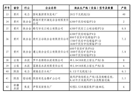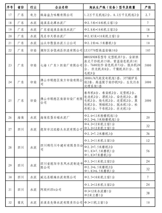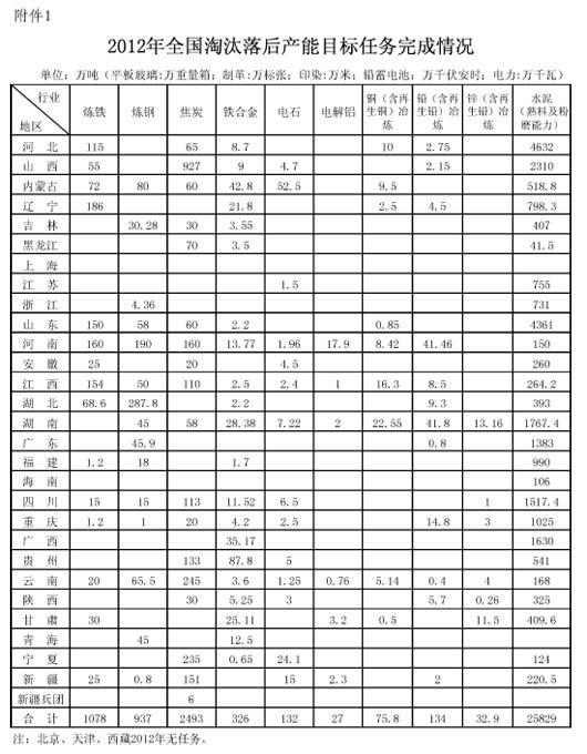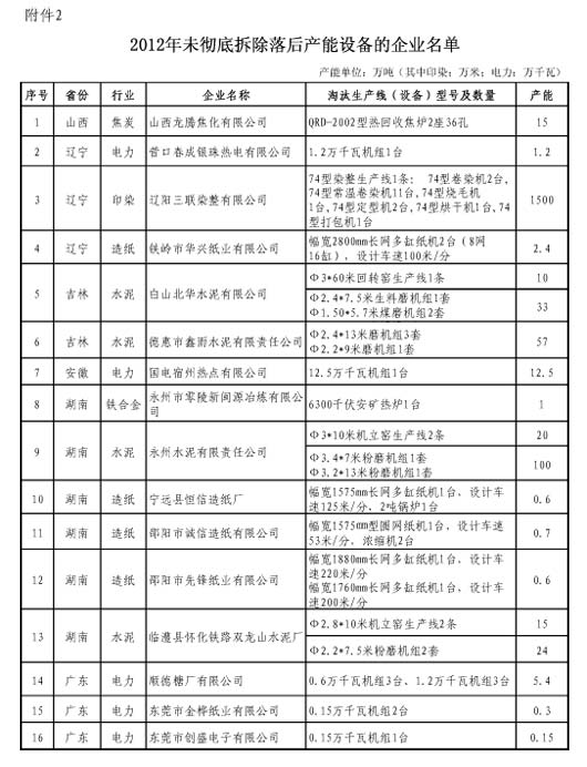 公告顯示,2012年全國共淘汰電力落后產能551.2萬千瓦、煤炭4355萬噸、煉鐵1078萬噸、煉鋼937萬噸、焦炭2493萬噸、鐵合金326萬噸、電石132萬噸、電解鋁27萬噸、銅(含再生銅)冶煉75.8萬噸、鉛(含再生鉛)冶煉134萬噸、鋅(含再生鋅)冶煉32.9萬噸、水泥(熟料及粉磨能力)25829萬噸、平板玻璃5856萬重量箱、造紙1057萬噸、酒精73.5萬噸、味精14.3萬噸、檸檬酸7萬噸、制革1185萬標張、印染325809萬米、化纖25.7萬噸、鉛蓄電池(極板及組裝)2971萬千伏安時。