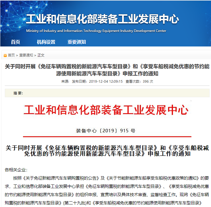 工信部:新能源汽車免征車輛購置稅車型目錄和享受車船稅減免優惠開始申報