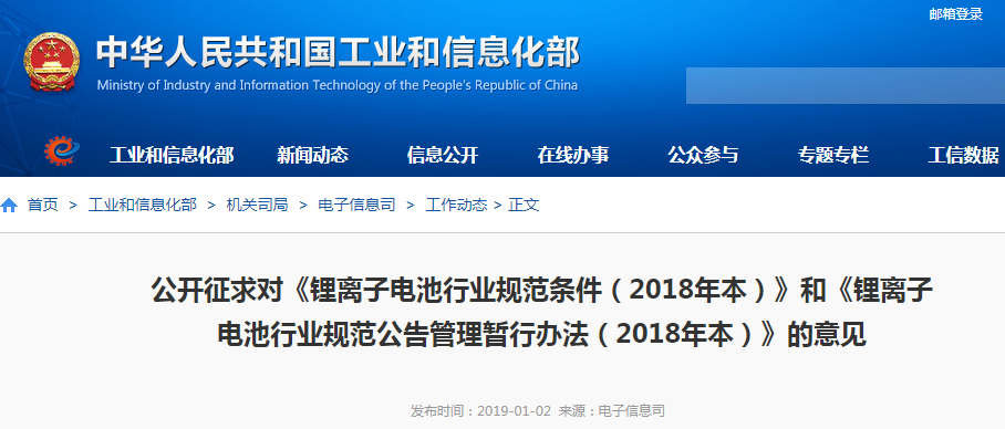 工信部就《鋰離子電池行業(yè)規(guī)范條件(2018年本)》等征求意見