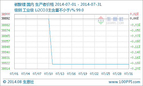 7月國內工業級碳酸鋰行情僅在中上旬小幅下行,月初價為月高價38893元/噸,月末價為月低價38821元/噸,月跌幅為0.18%,當前價格同比去年下降了6.93%。...