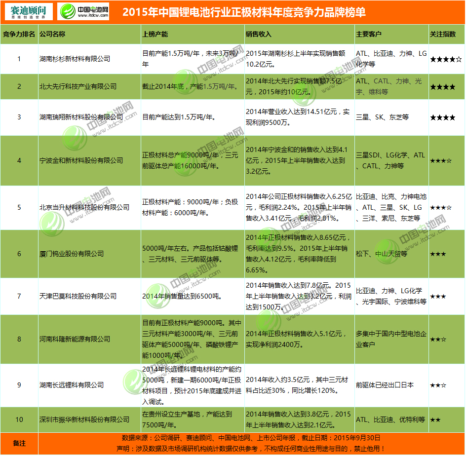 競爭力榜單是根據我國動力鋰電池及其產業鏈公司的產能數據、客戶分布、公司情況、誠信形象、品牌口碑等綜合評判指標得出,數據來源為公司實地調研、機構數據、上市公司披露年季報表、電話訪談(數據統計截止到2015年9月30日,僅供參考)。上榜企業由賽迪顧問鋰電產業研究小組進行了專家點評。...